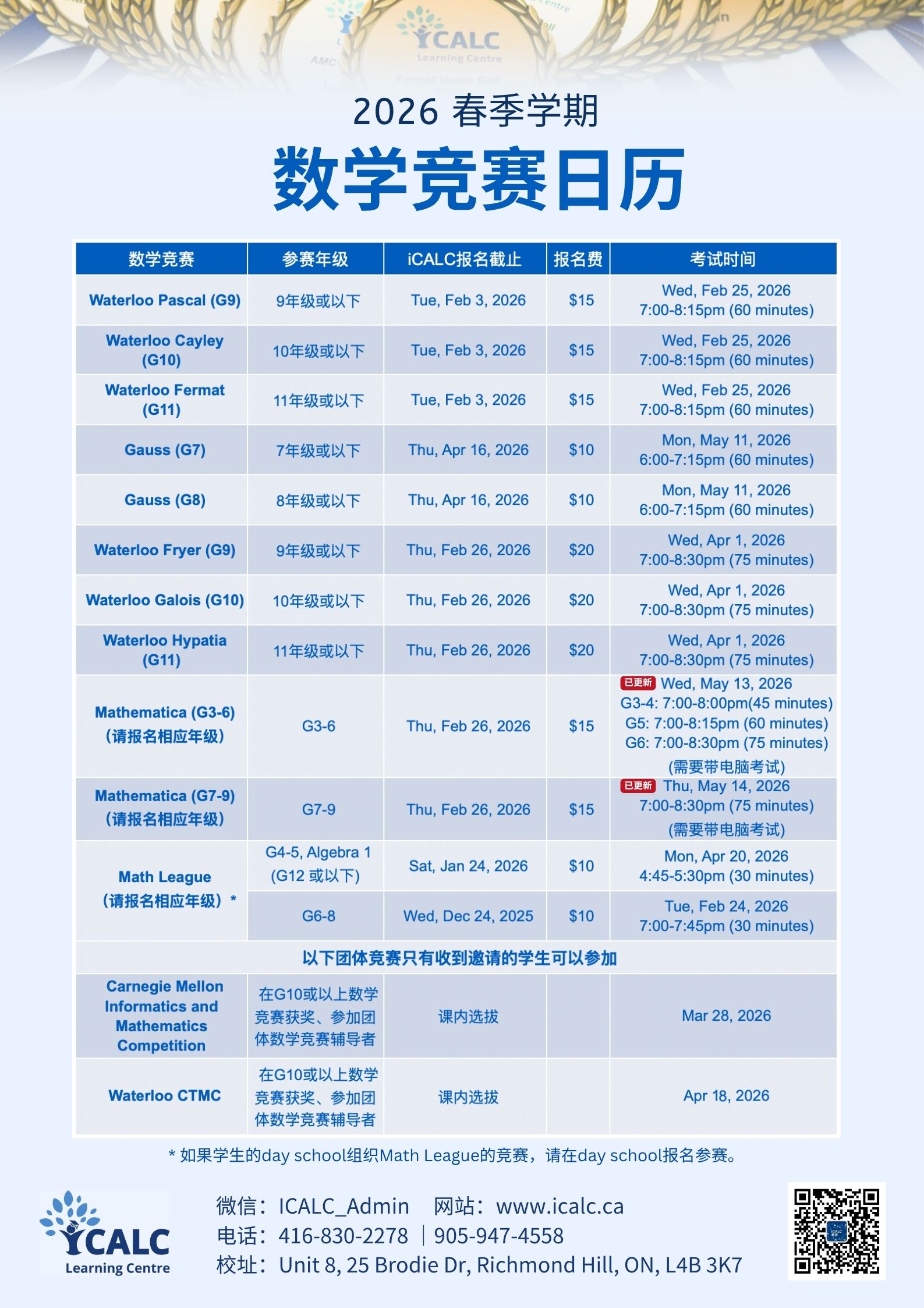 2025-2026 新学年开始了,各个重要的数学竞赛(2025秋季学期的CLMC、 COMC、CJMC、AMC8/10/12、BCC、CIMC、 CSMC、HMMT、PUMAC等,以及2026春季学期的滑铁卢Pascal竞赛、滑铁卢 Cayley竞赛、滑铁卢Fermat竞赛、高斯G7-8竞赛、滑铁卢Fryer竞赛、滑铁卢Galois竞赛、滑铁卢Hypatia竞赛以及Mathematica 和Math league竞赛等)都将接踵而至,是同学们冲刺竞赛成绩的黄金时期。