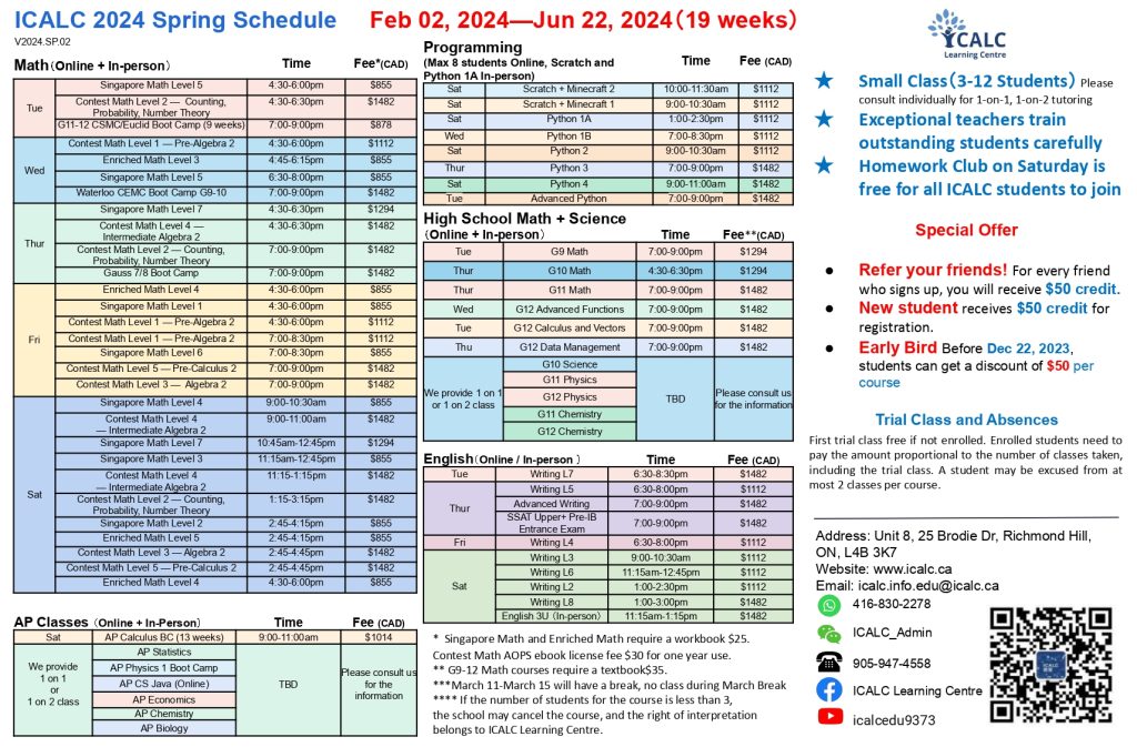 We promise that iCALC students will make more progress and achieve even better results! Enroll now and enjoy the $50 Early Bird Discount for each course (ends 12.22), as well as a variety of preferred privileges and extra surprises! Hurry up and lock in your free place at Homework Club every Saturday and other great benefits!