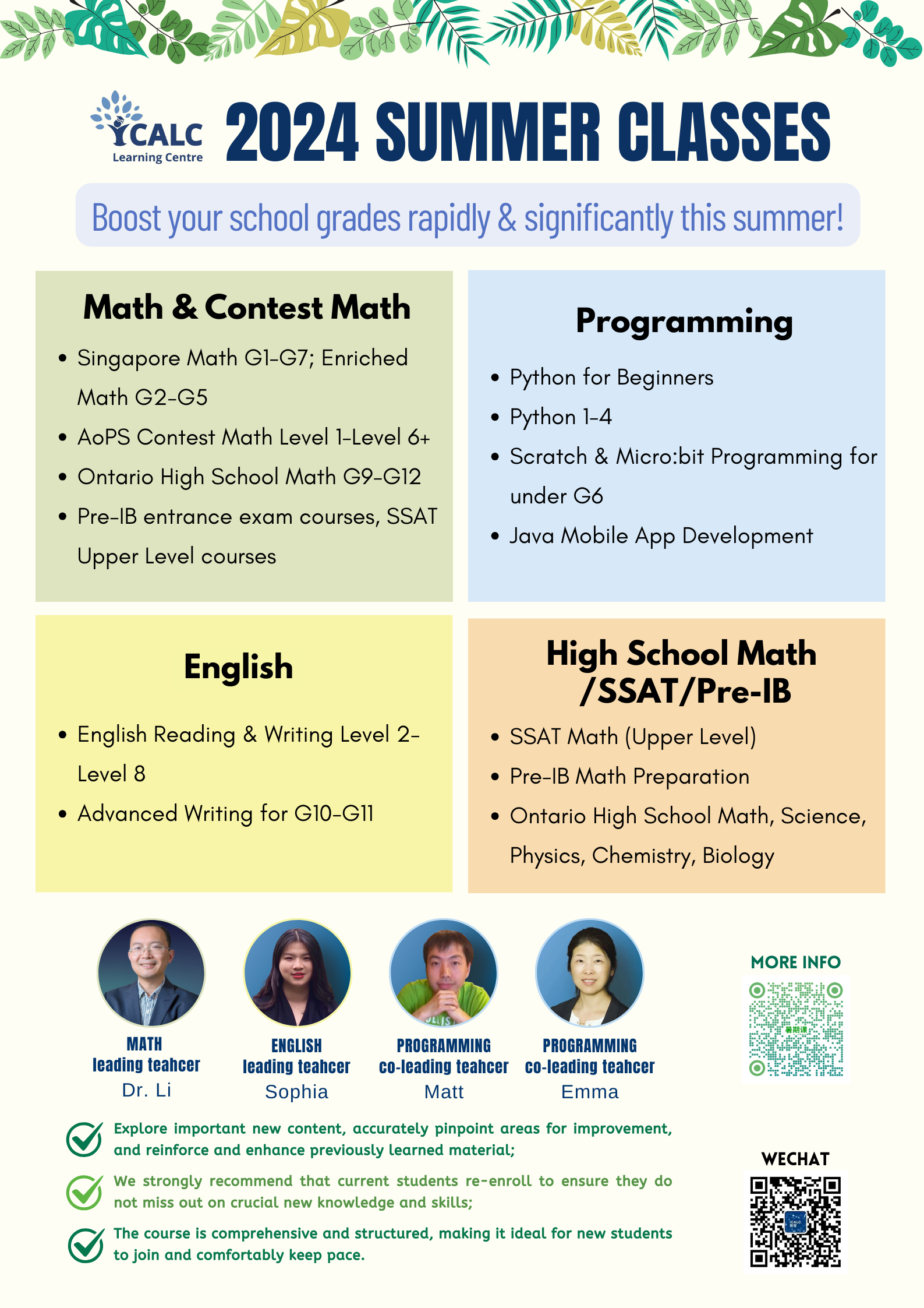 Want to make the most of your summer break and significantly improve your academic performance? iCALC offers summer semester courses every year specifically designed to achieve this goal. These courses ensure that students' learning isn't interrupted, allowing them to efficiently utilize the long vacation period. It's a combination of work and play, facilitating rapid growth and overtaking on the academic curve!